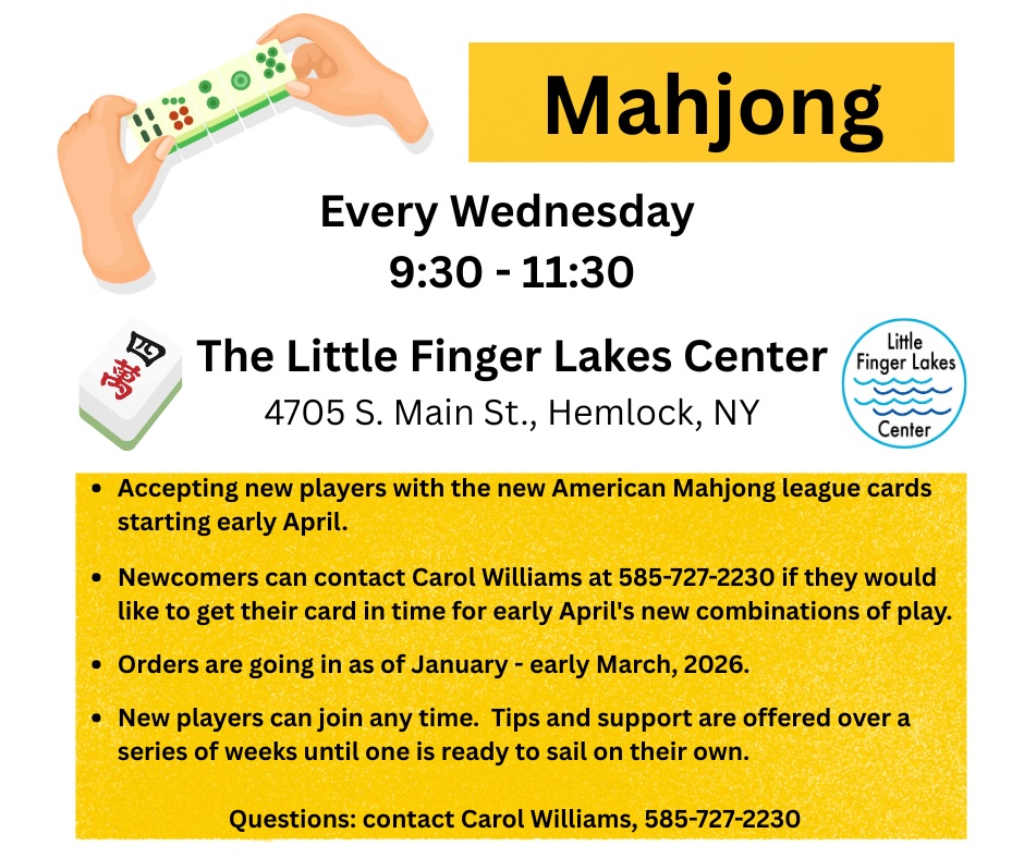If you would like to send a check, make it payable to “The Little Finger Lakes Center” and send to 4705 S. Main St. Hemlock, NY 14466.